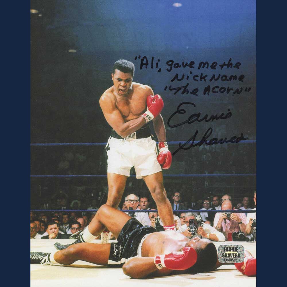 Offered here is a Ali/Sonny Liston photo which measures 8" x 10" in size and has been hand-signed and inscribed in black felt-tip pen by Earnie Shavers.